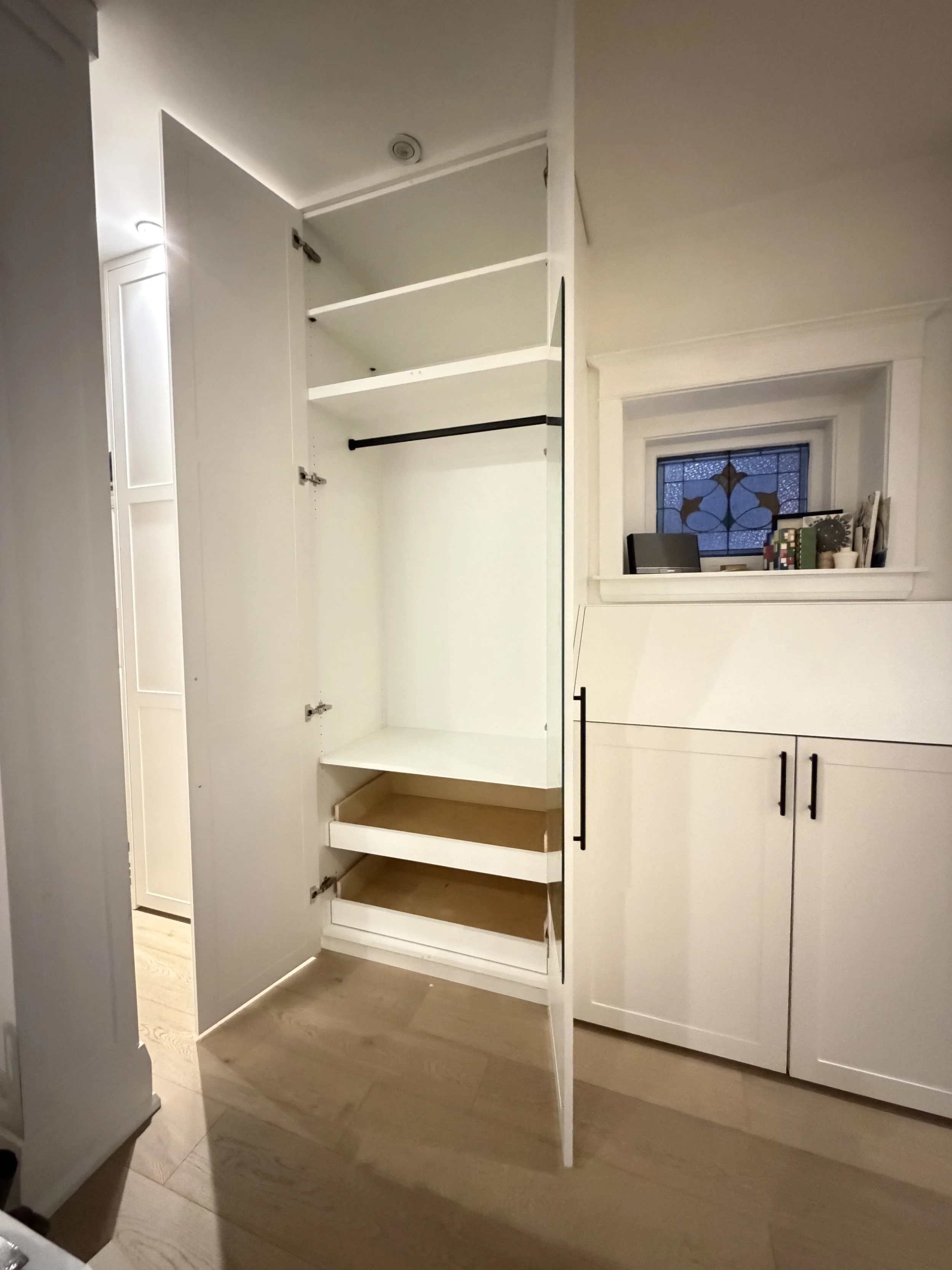 Transform your space with the perfect blend of style and function! This custom decorative wall features sleek vertical wood slats, integrated coat hooks, and a built-in mirror - creating a modern, warm, and practical space.